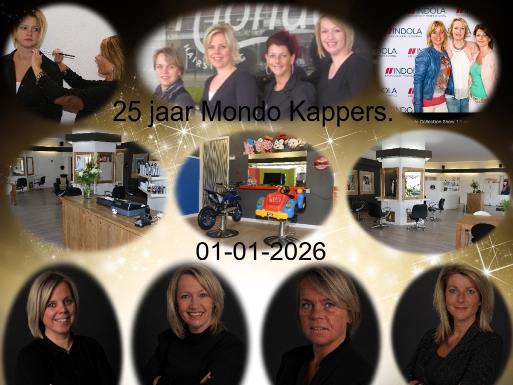 Feest bij Mondo kappers!, wij bestaan 25 jaar. Om dat te vieren, de hele maand januari 25%korting op alle verzorging en styling producten.